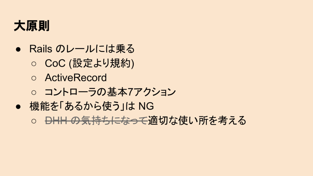 大原則 • Rails のレールには乗る ◦ CoC (設定より規約) ◦ ActiveRecord ◦