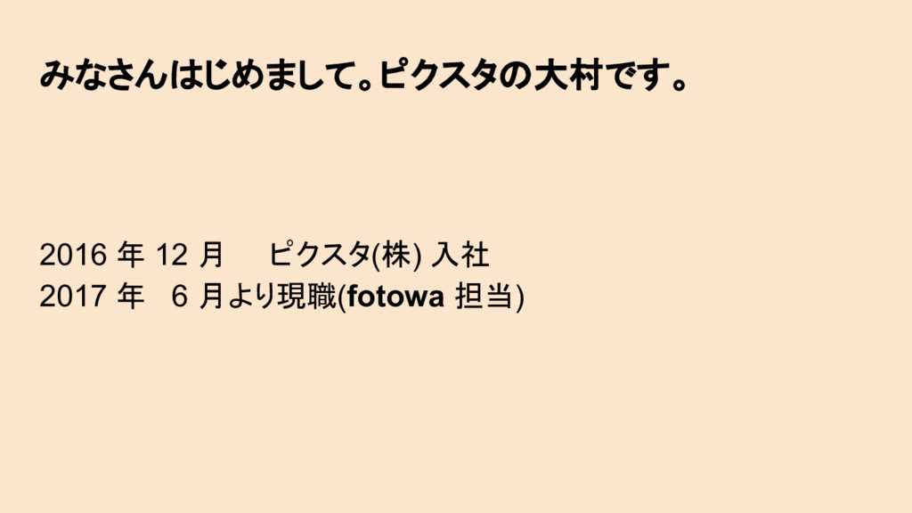 みなさんはじめまして。ピクスタの大村です。 2016 年 12 月 ピクスタ(株) 入社 2017 年 6