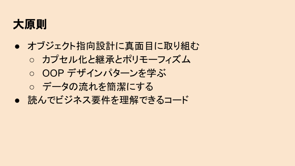 大原則 • オブジェクト指向設計に真面目に取り組む ◦ カプセル化と継承とポリモーフィズム ◦ OOP デザインパターンを学ぶ ◦ データの流れを簡潔にする
