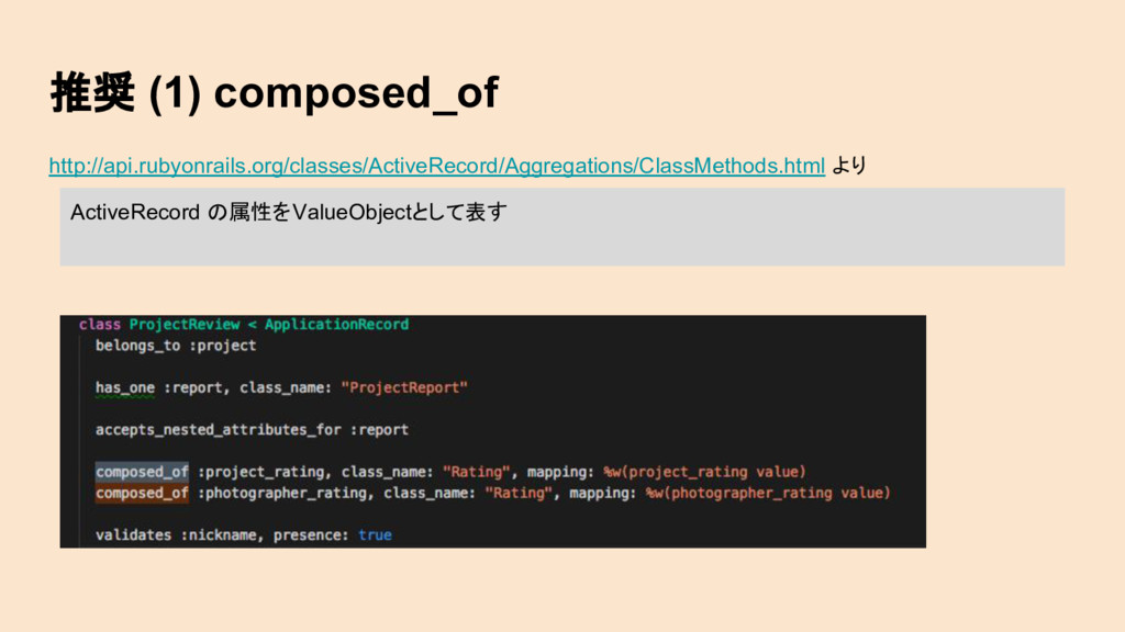 推奨 (1) composed_of http://api.rubyonrails.org/classes/ActiveRecord/Aggregations/ClassMethods.html より ActiveRecord の属性をValueObjectとして表す