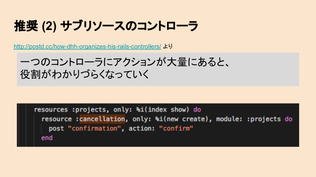 推奨 (2) サブリソースのコントローラ http://postd.cc/how-dhh-organizes-his-rails-controllers/ より 一つのコントローラにアクションが大量にあると、 役割がわかりづらくなっていく