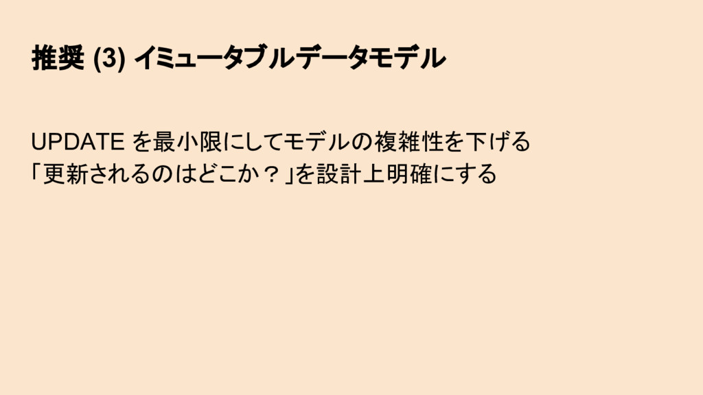 推奨 (3) イミュータブルデータモデル UPDATE を最小限にしてモデルの複雑性を下げる 「更新されるのはどこか?」を設計上明確にする