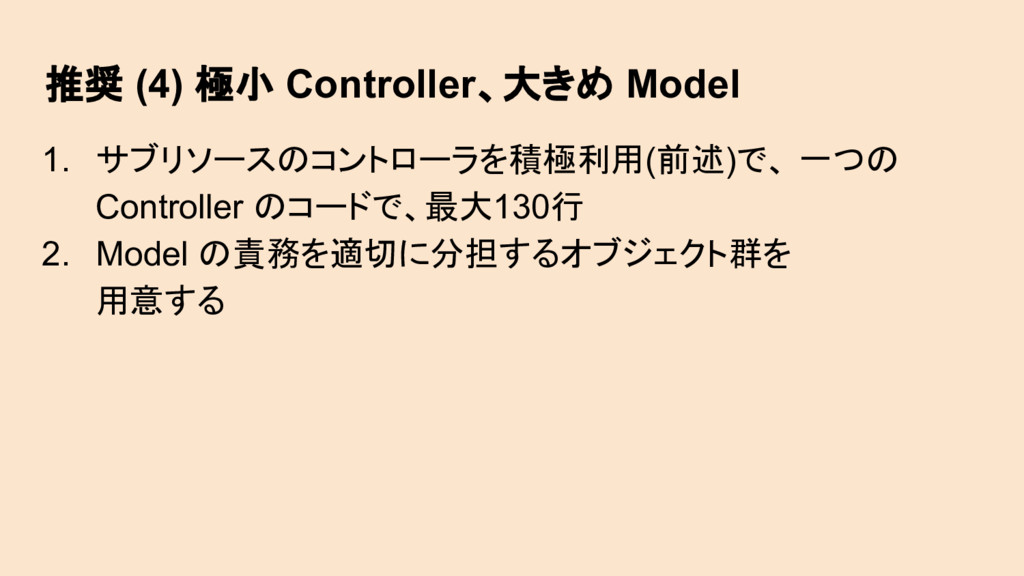 推奨 (4) 極小 Controller、大きめ Model 1. サブリソースのコントローラを積極利用(前述)で、 一つの Controller のコードで、最大130行