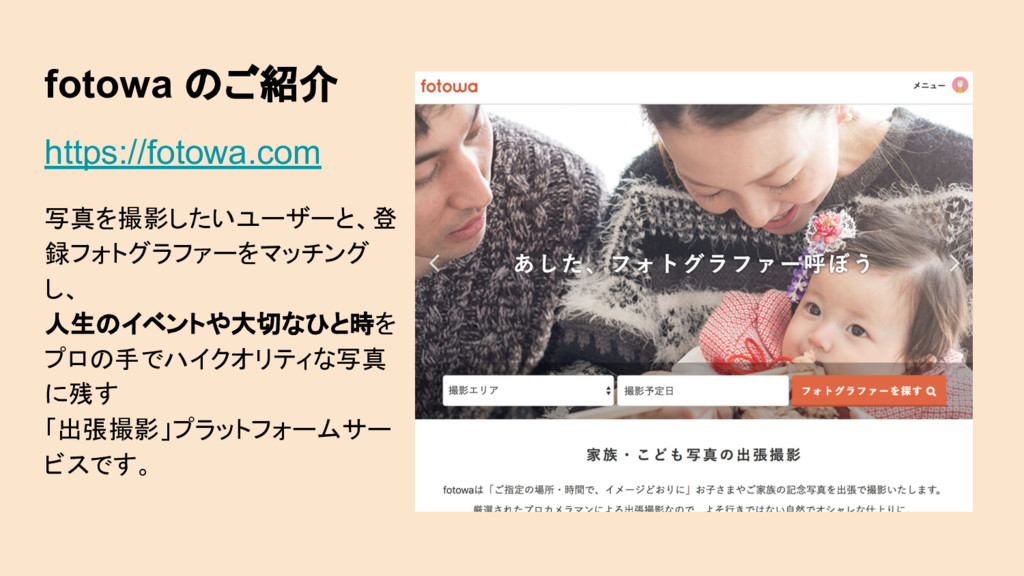 fotowa のご紹介 写真を撮影したいユーザーと、登 録フォトグラファーをマッチング し、 人生のイベントや大切なひと時を プロの手でハイクオリティな写真 に残す 「出張撮影」プラットフォームサー ビスです。