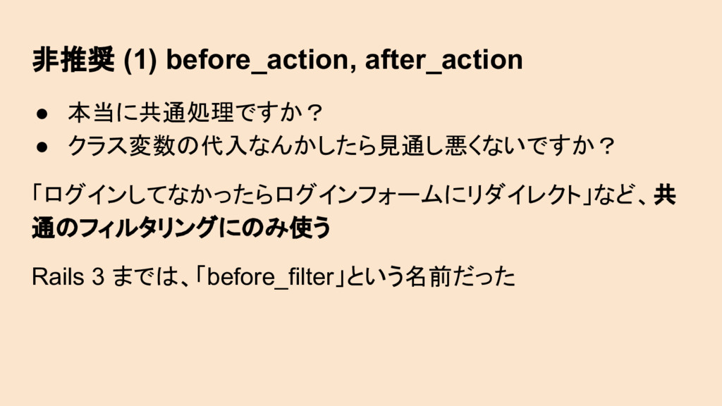非推奨 (1) before_action, after_action • 本当に共通処理ですか? • クラス変数の代入なんかしたら見通し悪くないですか? 「ログインしてなかったらログインフォームにリダイレクト」など、共 通のフィルタリングにのみ使う
