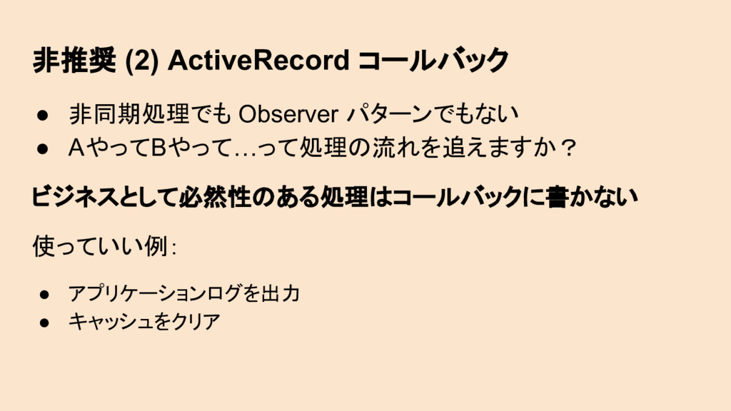非推奨 (2) ActiveRecord コールバック • 非同期処理でも Observer パターンでもない • AやってBやって…って処理の流れを追えますか?