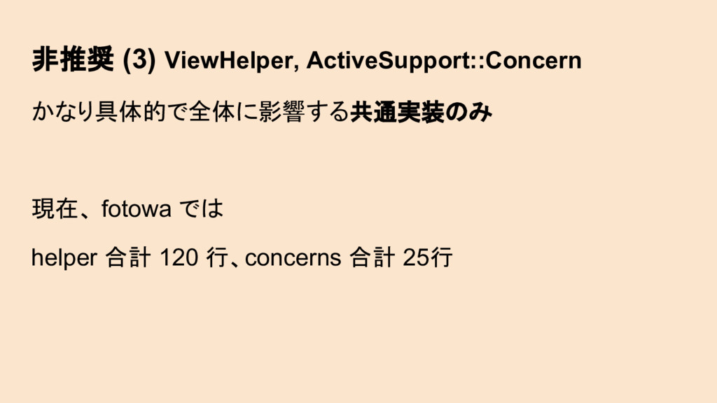 非推奨 (3) ViewHelper, ActiveSupport::Concern かなり具体的で全体に影響する共通実装のみ 現在、 fotowa では helper 合計