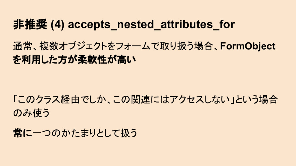 非推奨 (4) accepts_nested_attributes_for 通常、複数オブジェクトをフォームで取り扱う場合、FormObject を利用した方が柔軟性が高い 「このクラス経由でしか、この関連にはアクセスしない」という場合 のみ使う 常に一つのかたまりとして扱う