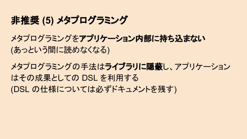 非推奨 (5) メタプログラミング メタプログラミングをアプリケーション内部に持ち込まない (あっという間に読めなくなる) メタプログラミングの手法はライブラリに隠蔽し、アプリケーション はその成果としての DSL を利用する (DSL