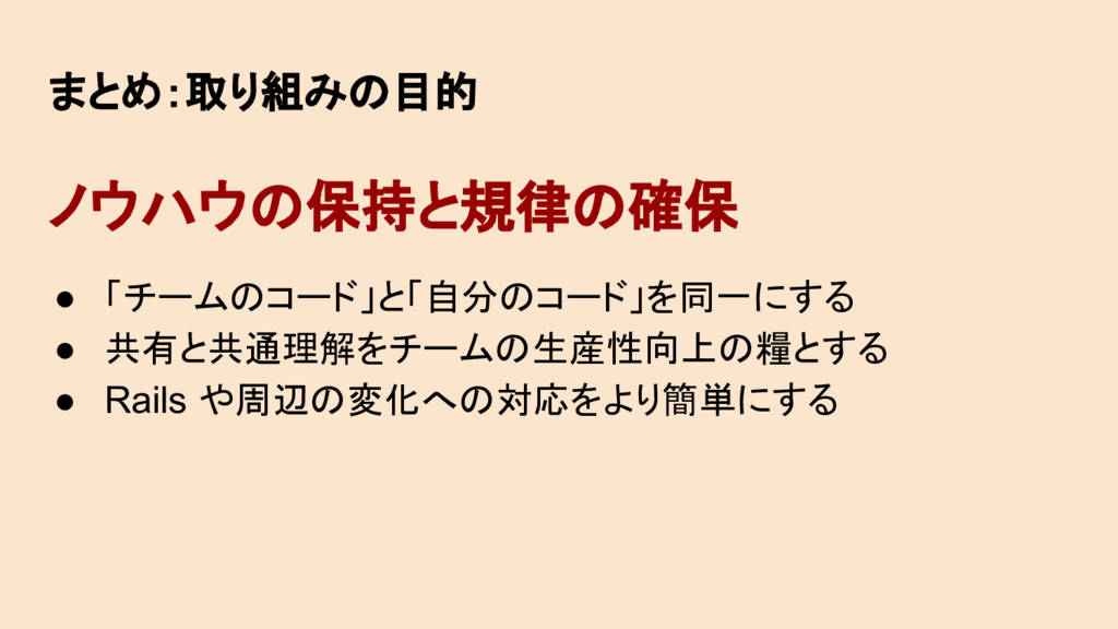 まとめ:取り組みの目的 ノウハウの保持と規律の確保 • 「チームのコード」と「自分のコード」を同一にする • 共有と共通理解をチームの生産性向上の糧とする • Rails や周辺の変化への対応をより簡単にする