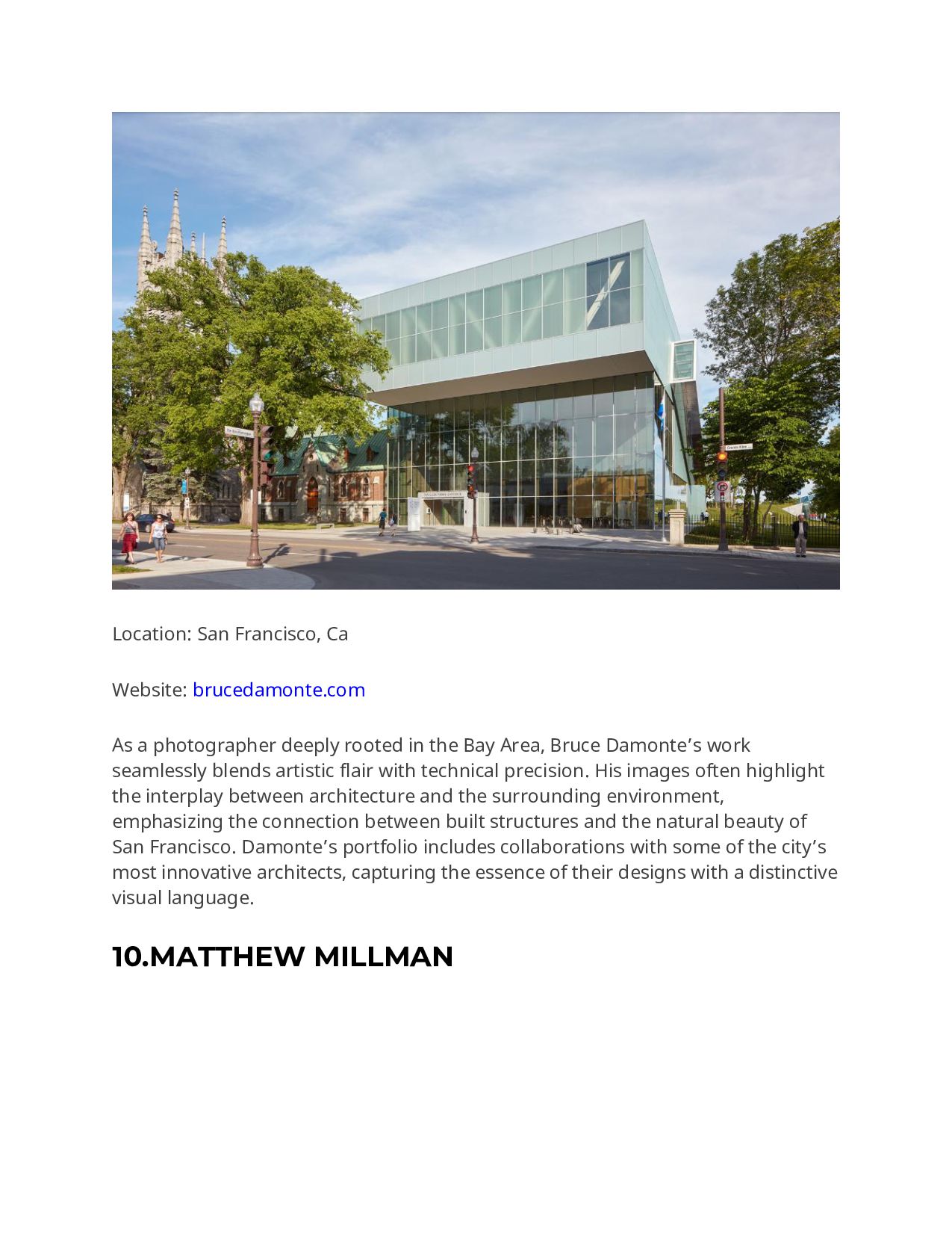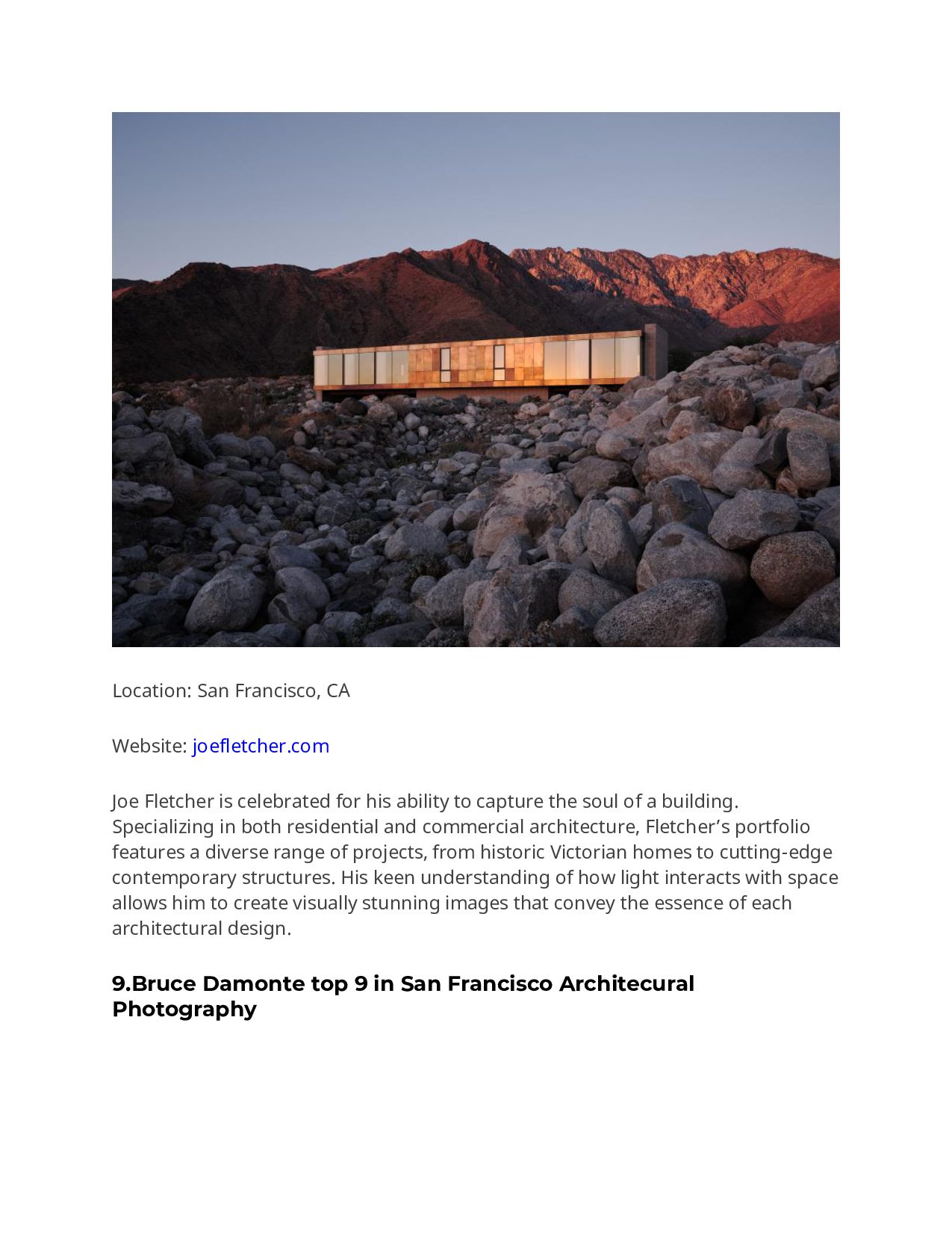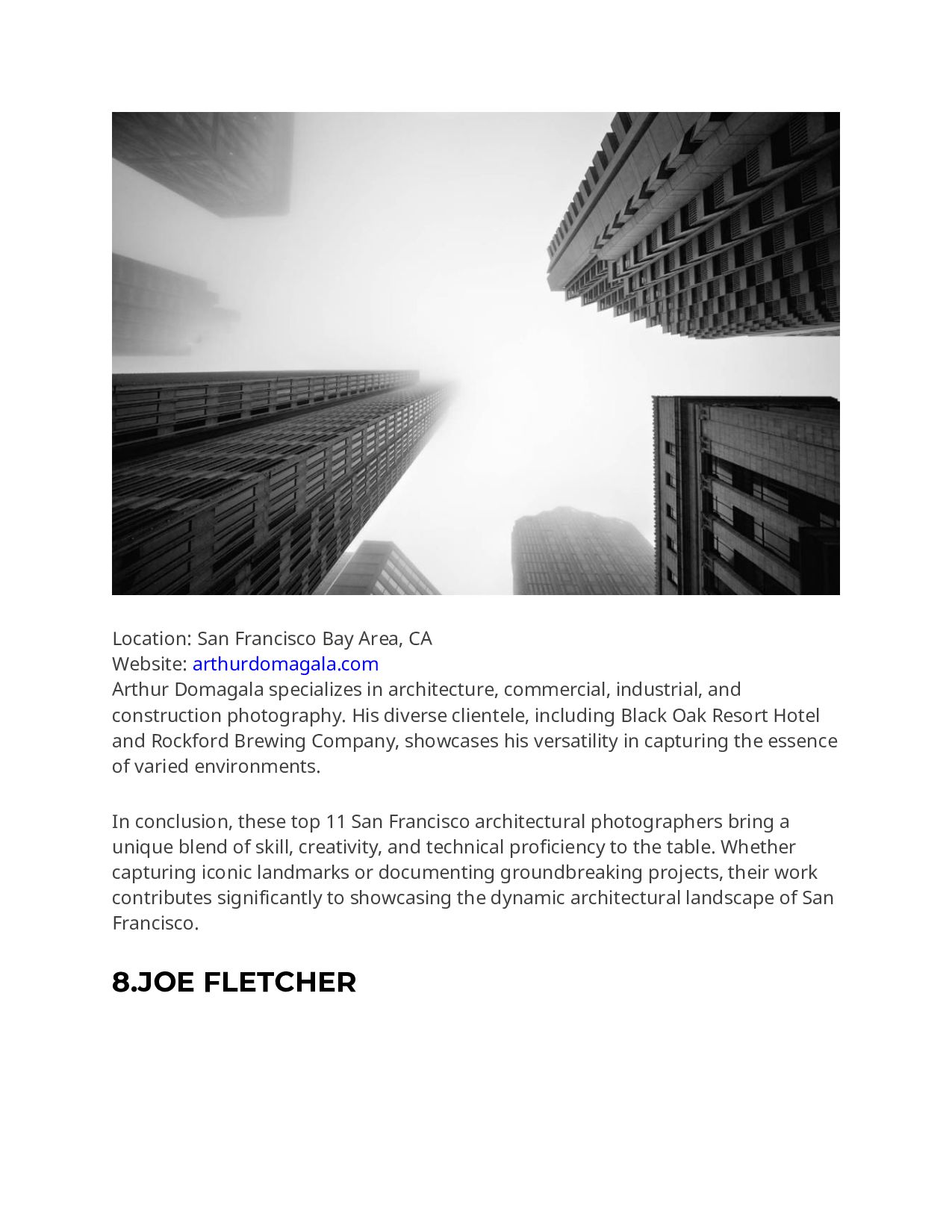 specializes in architecture, commercial, industrial, and construction photography. His diverse clientele, including Black Oak Resort Hotel and Rockford Brewing Company, showcases his versatility in capturing the essence of varied environments. In conclusion, these top 11 San Francisco architectural photographers bring a unique blend of skill, creativity, and technical proficiency to the table. Whether capturing iconic landmarks or documenting groundbreaking projects, their work contributes significantly to showcasing the dynamic architectural landscape of San Francisco. 8.JOE FLETCHER