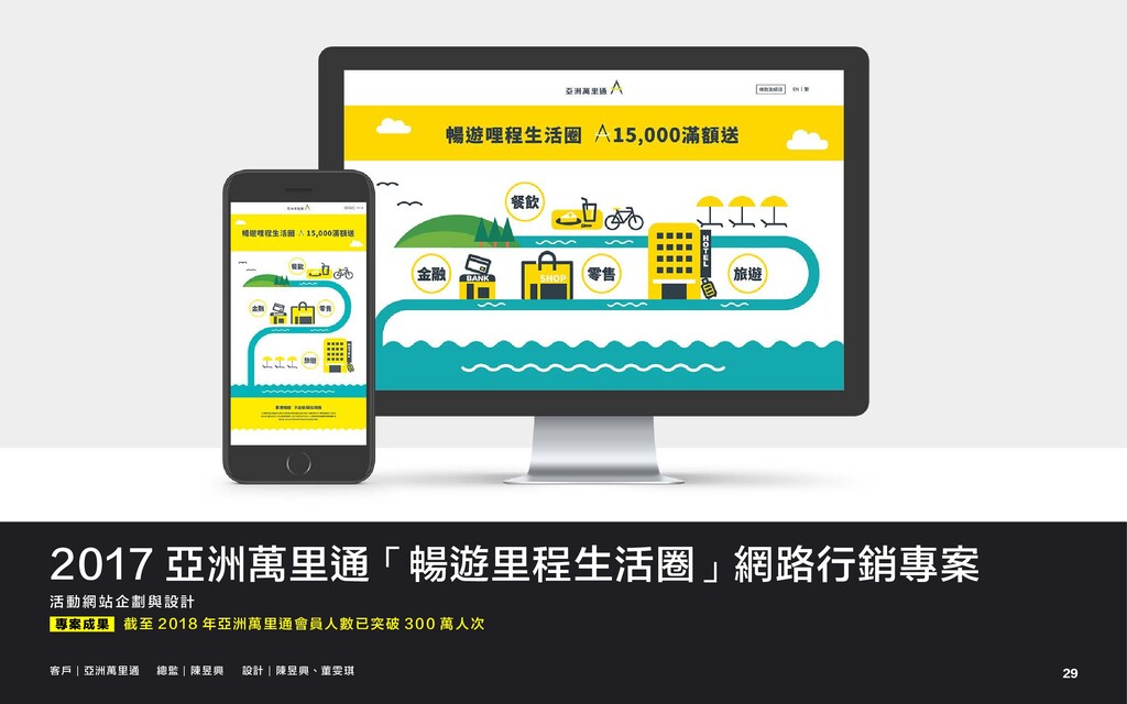 計 專案成果 截至 2018 年亞洲萬里通會員人數已突破 300 萬人次 客戶|亞洲萬里通 總監|陳昱興 設計|陳昱興、董雯琪 29