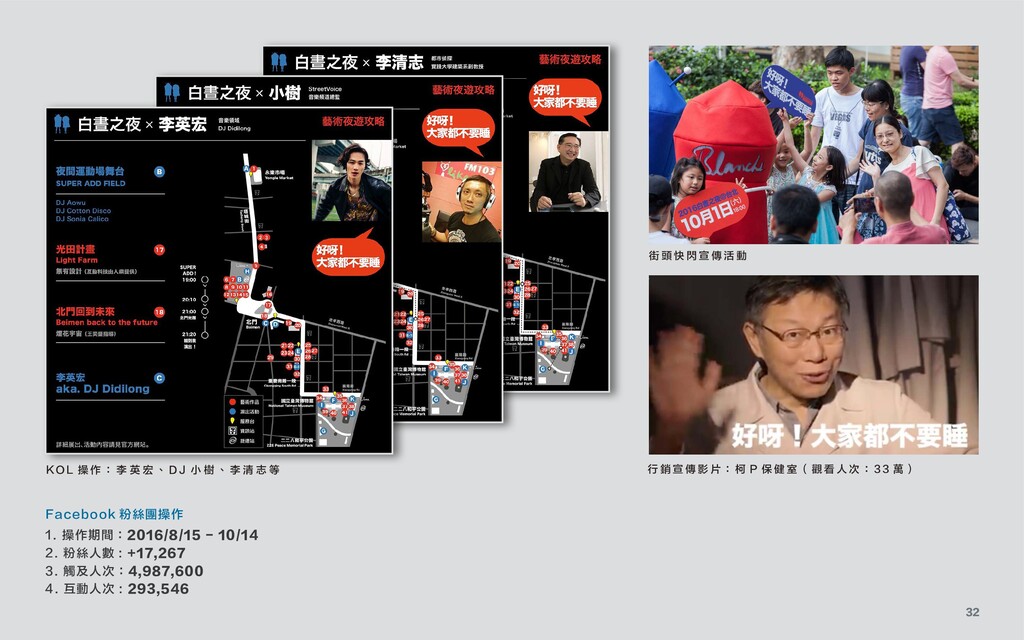3. 觸及人次:4,987,600 4. 互動人次 : 293,546 KO L 操 作 : 李 英 宏 、 DJ 小 樹 、 李 清 志 等 行 銷 宣 傳 影 片 : 柯 P 保 健 室 ( 觀 看 人 次 : 3 3 萬 ) 街 頭 快 閃 宣 傳 活 動 32