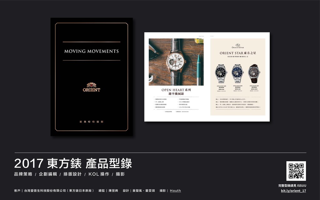 編 輯 / 排 版 設 計 / KOL 操 作 / 攝 影 客戶 | 台灣愛普生科技股份有限公司(東方錶日本原廠) 總監 | 陳昱興 設計|黃聖嵐、董雯琪 攝影| Houth 完整型錄請見 ISSUU bit.ly/orient_17