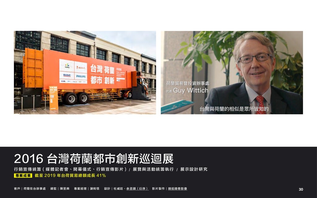 體 記 者 會 、 開 幕 儀 式 、 行 銷 宣 傳 影 片 ) / 展 覽 與 活 動 統 籌 執 行 / 展 示 設 計 研 究 專案成果 截至 2019 年台荷貿易總額成長 41 % 客戶|荷蘭在台辦事處 總監|陳昱興 專案經理|謝宛恬 設計|杜威廷、余咨穎(衍序) 影片製作|陸拾陸巷影像 30