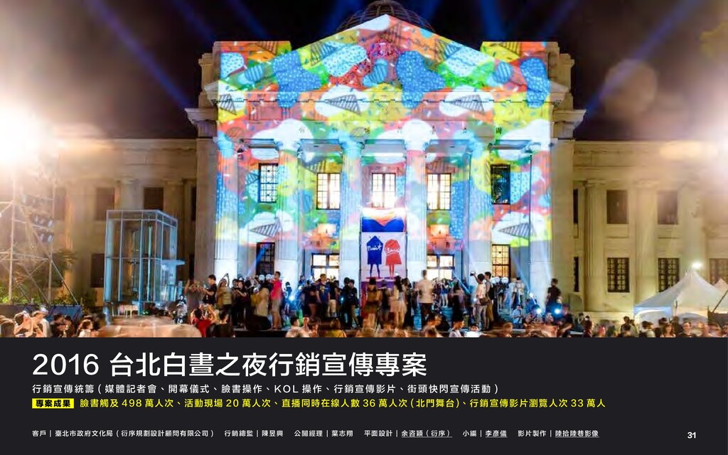 體 記 者 會 、 開 幕 儀 式 、 臉 書 操 作 、 K O L 操 作 、 行 銷 宣 傳 影 片 、 街 頭 快 閃 宣 傳 活 動 ) 專案成果 臉書觸及 498 萬人次、活動現場 20 萬人次、直播同時在線人數 36 萬人次 ( 北門舞台 )、行銷宣傳影片瀏覽人次 33 萬人 客戶 | 臺北市政府文化局 ( 衍序規劃設計顧問有限公司 ) 行銷總監 | 陳昱興 公關經理 | 葉志翔 平面設計 | 余咨穎(衍序) 小編 | 李彥儀 影片製作 | 陸拾陸巷影像 31