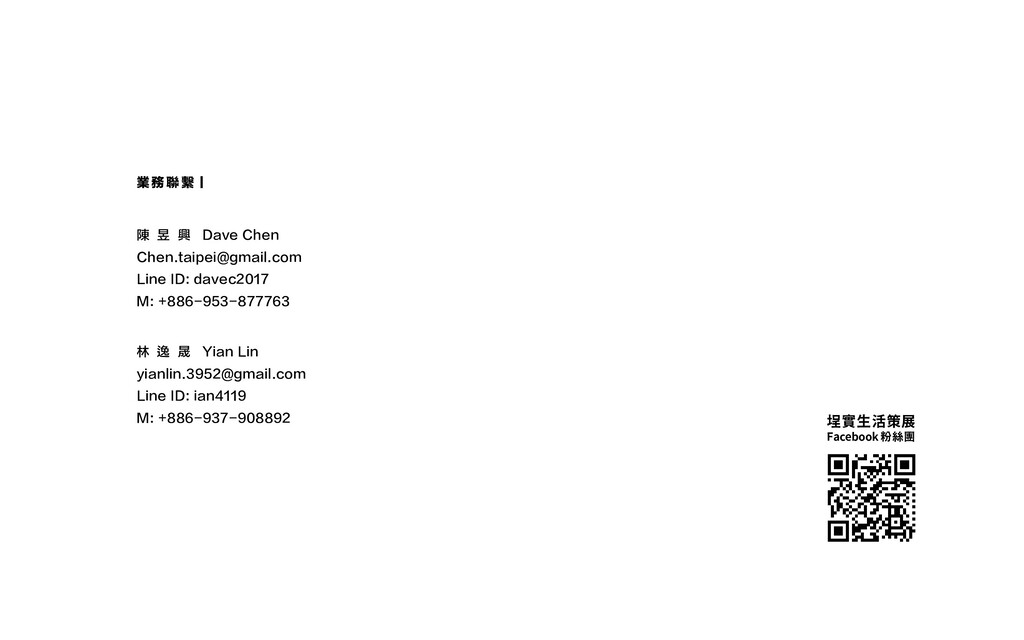 Line ID: ian4119 M: +886-937-908892 埕實生活策展 Facebook 粉絲團