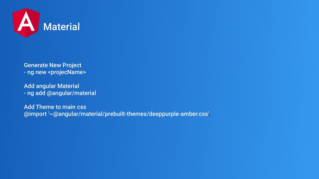 - ng add @angular/material Add Theme to main css @import '~@angular/material/prebuilt-themes/deeppurple-amber.css'; Material