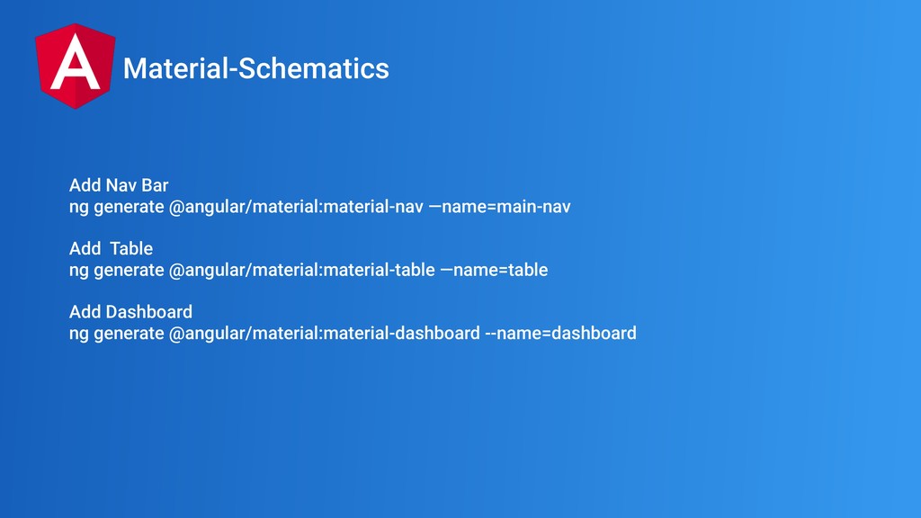 generate @angular/material:material-table —name=table Add Dashboard ng generate @angular/material:material-dashboard --name=dashboard Material-Schematics
