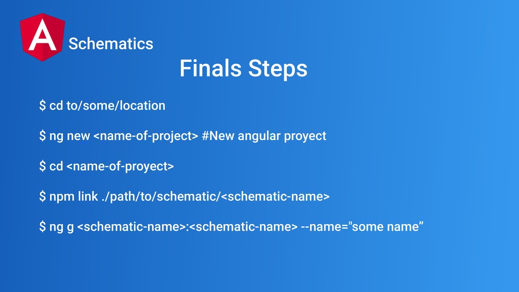 $ cd <name-of-proyect> $ npm link ./path/to/schematic/<schematic-name> $ ng g <schematic-name>:<schematic-name> --name="some name” Schematics Finals Steps