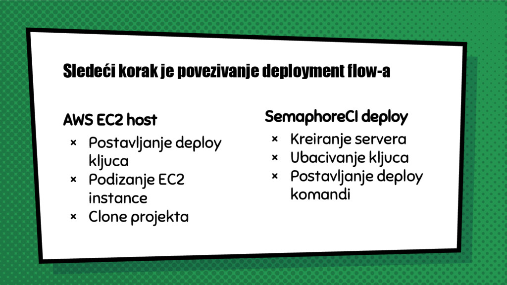instance × Clone projekta Sledeći korak je povezivanje deployment flow-a SemaphoreCI deploy × Kreiranje servera × Ubacivanje kljuca × Postavljanje deploy komandi