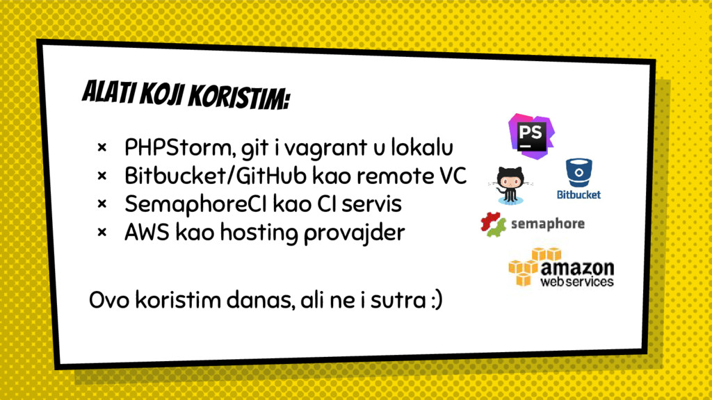 × Bitbucket/GitHub kao remote VC × SemaphoreCI kao CI servis × AWS kao hosting provajder Ovo koristim danas, ali ne i sutra :)