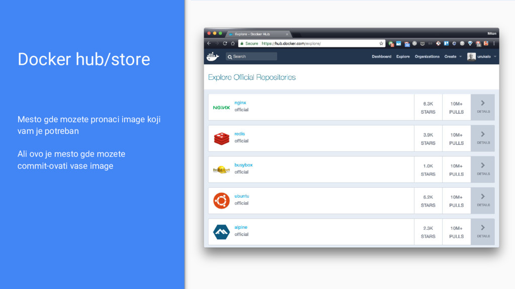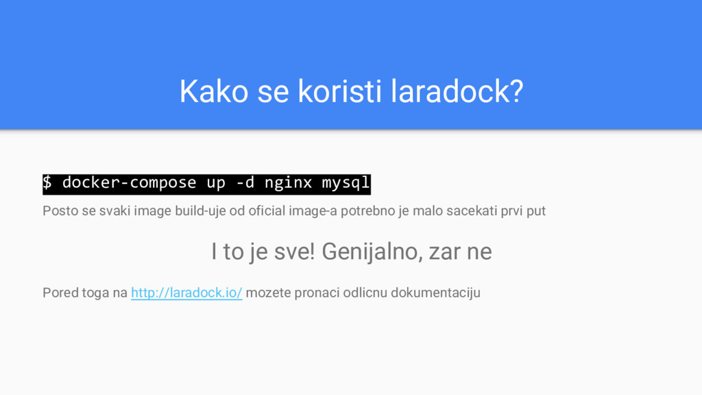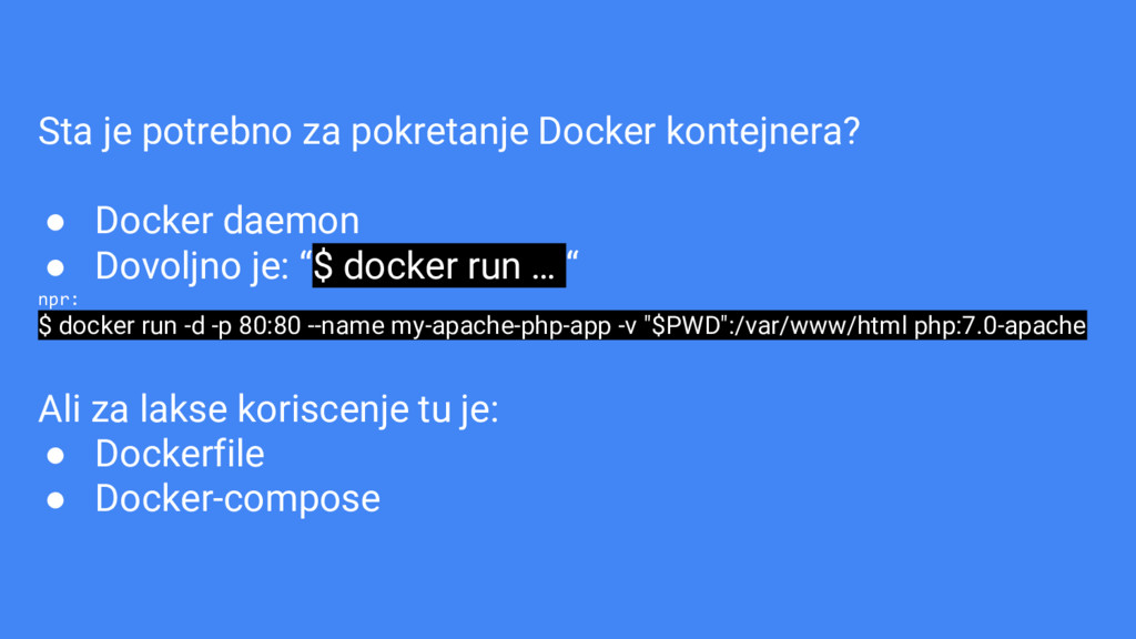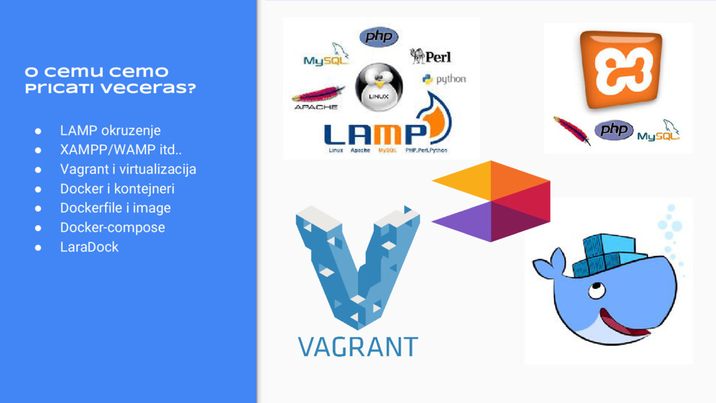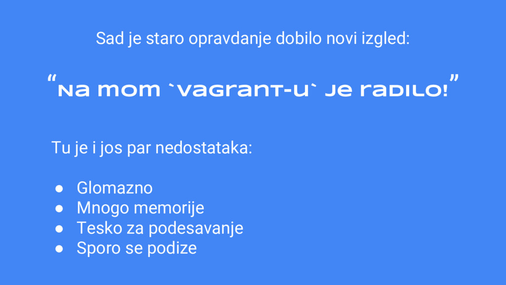 Kad je u pitanju razvoj softvera vec duže vreme se koristi izgovor “Radi na mom računaru”. Ovim predavanjem ćemo uz pomoć Docker-a pokušati da iskorenimo taj stari običaj koji je nastao u vreme LAMP/XAMP/WAMP okruženja, a održao se i u vremenu virtualnih mašina i Vagrant-a. Saznaćemo šta su to Docker container-i, kako se kreiraju iz image-a. Videti kako je lako podići lokalno dev okruženje, jednostavno menjati ga, kao i testirati našu aplikaciju u različitim uslovima..