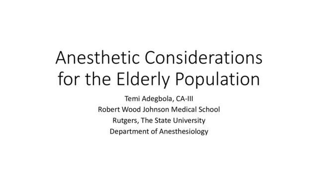 needed compared to younger patients • May attempt to reduce the amount of propofol with use of adjuncts, such as opioids, or combination of small dose of propofol with etomidate • However, must be careful not to underdose as there can be a excessive hypertensive response to intubation • Decrease in both systemic vascular resistance and cardiac output • Largest contributor is decrease in SVR • Must be cautious with fluid administration as fluid shifts (esp. in the postoperative period) can push an elderly heart into diastolic heart failure. • If using positive pressure ventilation, goal should be to have the lung volume exceed closing capacity to prevent atelectasis • Preferred approach is modest TV plus PEEP • Older patients are at double to the risk of residual neuromuscular blockade and adverse respiratory events