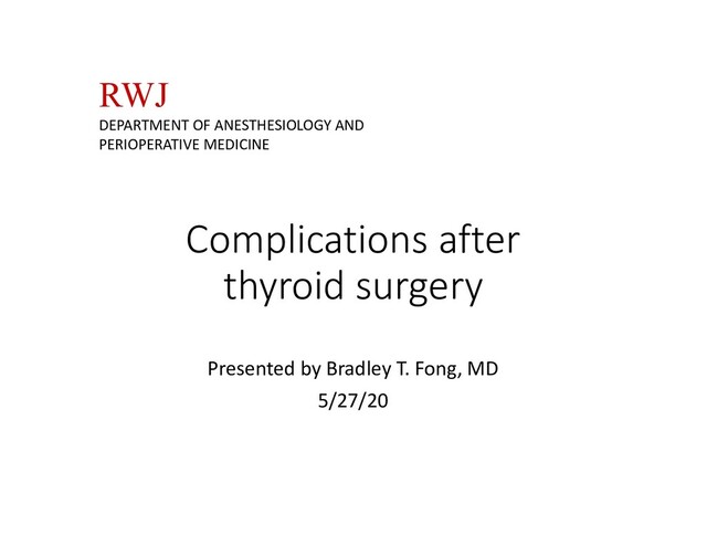 of an Expanding Neck Hematoma in the PACU”. EC Anaesthesia 5.12s (2019): 37-44. • Bajwa SJ, Sehgal V. Anesthesia and thyroid surgery: The never ending challenges. Indian J Endocrinol Metab. 2013;17(2):228-234. • Zakaria HM, Al Awad NA, Al Kreedes AS, et al. Recurrent laryngeal nerve injury in thyroid surgery. Oman Med J. 2011;26(1):34-38. doi:10.5001/omj.2011.09 • Dixon JL, et al. A novel method for the management of post- thyroidectomy or parathyroidectomy hematoma: a single-institution experience after over 4,000 central neck operations. World J Surg. 2014;38(6):1262-1267. • Miller, Ronald D. Miller's Anesthesia. 7th ed. Philadelphia, PA: Churchill Livingstone/Elsevier, 2010.14;38(6):207-211 & 443-445 • Michael Goldenberg, Sonia Vaida. Anesthetic Management of Post- Thyroidectomy Complications. Anesthesiology News: Clinical Anesthesiology. 2019. Accessed online 5/2020. • Truong A, Truong DT (2011) Vocal Cord Dysfunction: An Updated Review. Otolaryngol S1:002. Doi: 10.4172/2161-119X.S1-002