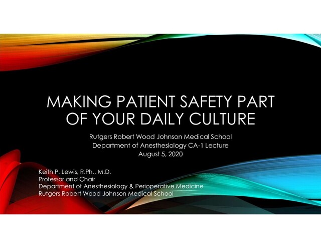 Wood Johnson Medical School Department of Anesthesiology CA-1 Lecture August 5, 2020 Keith P. Lewis, R.Ph., M.D. Professor and Chair Department of Anesthesiology & Perioperative Medicine Rutgers Robert Wood Johnson Medical School