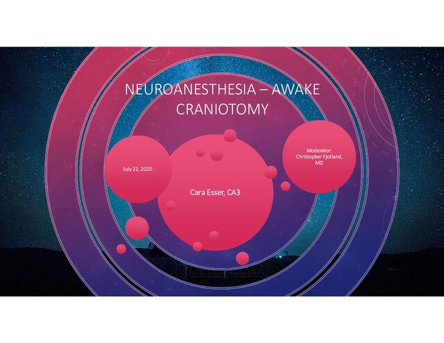 and Dysautoregulation." Anesthesiology Clinics. 2016 Sept; 34(3): 465-477. • Burnand, Cally and Joseph Sebastian. "Anaesthesia for Awake Craniotomy." Continuing Education in Anaesthesia, Critical Care & Pain. 2014. Vol 14 (1): 6-11. • Cottrell, James E. MD and William L. Young MD. Cottrell and Young's Neuroanesthesia. 5th ed. 2010. • Hartmann, Christina J., Sabine Fliegen, Stefan J. Groiss, Lars Wojtecki and Alfons Schnitzler. "An Update on Best Practice of Deep Brain Stimulation in Parkinson's Disease." Ther Adv Neurol Disord. 2019, Vol 12: 1-20. • Miller, Ronald E. MD, MS. Miller's Anesthesia. 8th ed. 2015. P 2158-2196. • OpenAnethesia. • Sewell Darreul and Martin Smith. "Awake Craniotomy: Anesthetic Considerations Based on Outcome Evidence." Current Opin Anesthesiol. 2019, 32: 546-552.