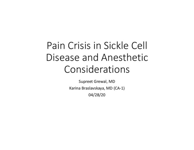 Non-pharmacologic • Heat/cold packs, distraction, relaxation, massage, music, acupuncture • Pharmacologic • Nonopioids (Acetaminophen, NSAIDS, topical agents and corticosteroids) • Opioids (mu-agonists, mixed agonists/antagonist buprenorphine and partial agonist pentazocine) • Adjuvants (Antihistamines, benzodiazepines, antidepressants, anticonvulsants) • Regional Techniques • Local anesthetics via neuraxial blocks or peripheral nerve blocks can be used but patients should be monitored closely as there have been case reports of sickle cell crises induced peripheral neuropathy after neuraxial blocks • Transfusion • No data that supports routine transfusion; does not shorten the duration of a pain crisis