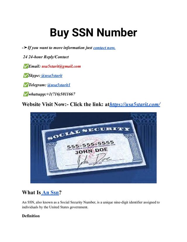 contact now. 24 24-hour Reply/Contact ✅Email: [email protected] ✅Skype: @usa5starit ✅Telegram: @usa5starit1 ✅whatsapp:+1(716)5011667 Website Visit Now:- Click the link: athttps://usa5starit.com/ What Is An Ssn? An SSN, also known as a Social Security Number, is a unique nine-digit identifier assigned to individuals by the United States government. Definition