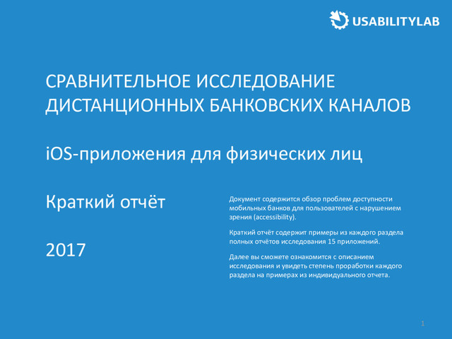 Примеры слайдов из общего и индивидуального отчетов USABILITYLAB о сравнительном исследовании мобильных банковских приложений-2017 (подробнее об исследовании: www.rating.usabilitylab.ru). Первая часть презентации — подарок от USABILITYLAB: отчет о доступности интерфейсов мобильных банковских приложений для людей с ограниченными возможностями. Презентация была разослана участникам бизнес-завтрака «Безбарьерные банковские сайты, мобильные приложения и интернет-банки», проведенного USABILITYLAB 5 сентября 2017 года.