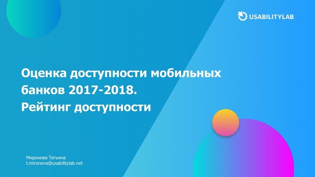 Российской Федерации выпустил информационные письма (от 12.05.2017 и от 23.10.2017) с рекомендациями по обеспечению доступности банковских услуг для ЛСИ, МГН и пожилого населения. В части обеспечения доступности ДБО в основу материалов легли рекомендации из следующих стандартов: 1. ГОСТ Р 52872-2012 Интернет-ресурсы: Требования доступности для инвалидов по зрению 2. WCAG 2.0 Руководство по обеспечению доступности веб-контента Все рекомендации из этих документов были собраны в единый чек-лист доступности от USABILITYLAB, где на данный момент насчитывается 107 рекомендаций по обеспечению доступности сайтов и приложений для пользователей с различными видами и степенью нарушений. На основе чек-листа будет проведена оценка доступности мобильных приложений банков, результаты которой будут представлены в виде Рейтинга доступности мобильных приложений банков 2018.