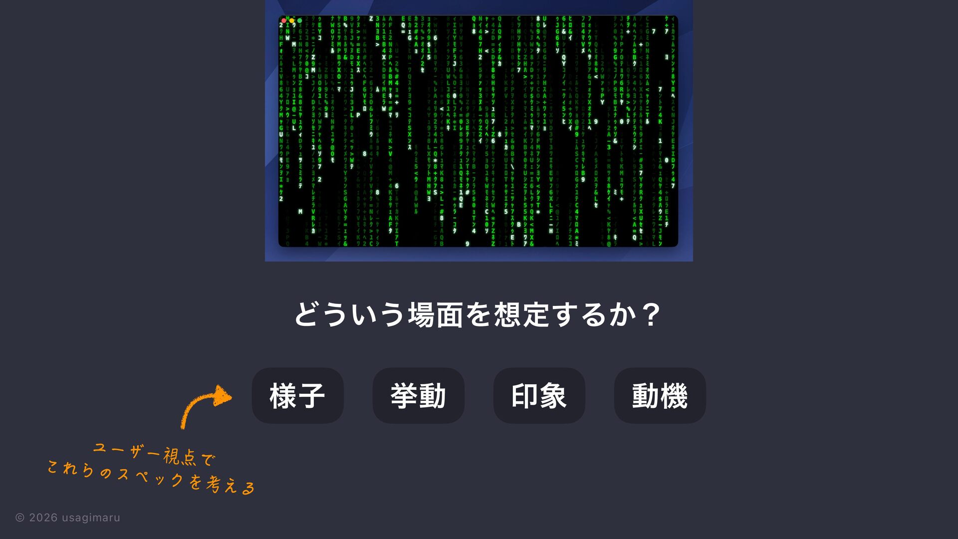 4. © 2026 usagimaru Ͳ͏͍͏৔໘Λ૝ఆ͢Δ͔ʁ ڍಈ ༷ࢠ ҹ৅ ಈػ ユーザー視点で これらのスペックを考える