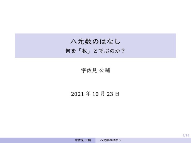 + 𝑎3 e3 + 𝑎4 e4 + 𝑎5 e5 + 𝑎6 e6 + 𝑎7 e7 とあらわされる数(𝑎𝑖 ∈ ℝ) 。 e2 1 = e2 2 = e2 3 = e2 4 = e2 5 = e2 6 = e2 7 = −1 e1 e2 = −e2 e1 = e3 , e2 e3 = −e3 e2 = e1 , e3 e1 = −e1 e3 = e2 e1 e4 = −e4 e1 = e5 , e4 e5 = −e5 e4 = e1 , e5 e1 = −e1 e5 = e4 e2 e4 = −e4 e2 = e6 , e4 e6 = −e6 e4 = e2 , e6 e2 = −e2 e6 = e4 e3 e4 = −e4 e3 = e7 , e4 e7 = −e7 e4 = e3 , e7 e3 = −e3 e7 = e4 e5 e3 = −e3 e5 = e6 , e3 e6 = −e6 e3 = e5 , e6 e5 = −e5 e6 = e3 e6 e1 = −e1 e6 = e7 , e1 e7 = −e7 e1 = e6 , e7 e6 = −e6 e7 = e1 e7 e2 = −e2 e7 = e5 , e2 e5 = −e5 e2 = e7 , e5 e7 = −e7 e5 = e2 宇佐見 公輔 八元数のはなし