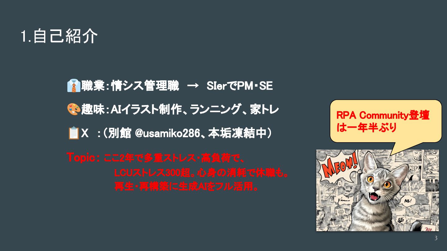 1.自己紹介 3 👔職業:情シス管理職 → SIerでPM・SE 🎨趣味:AIイラスト制作、ランニング、家トレ 📋X :(別館 @usamiko286、本垢凍結中) Topic:
