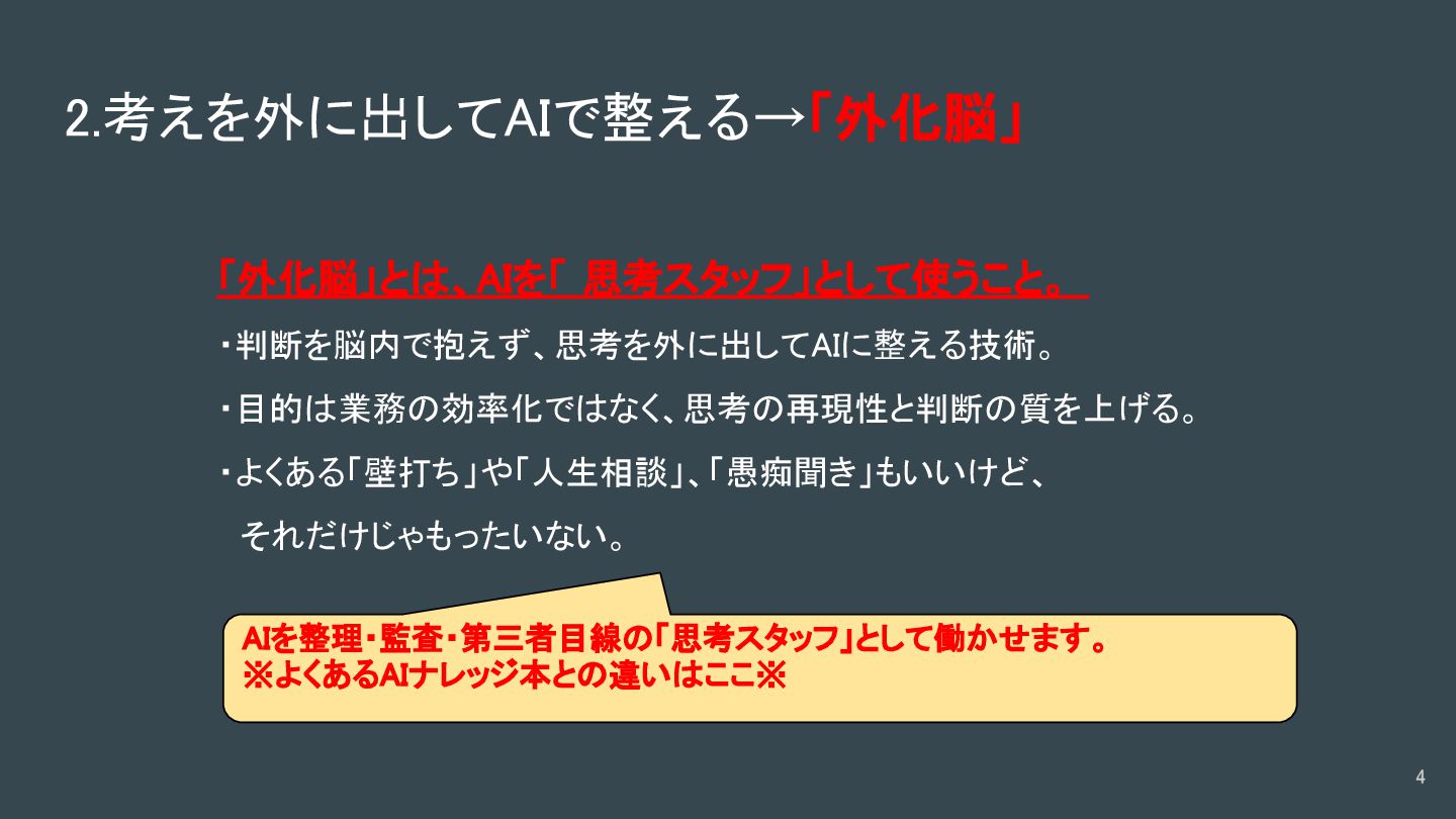 2.考えを外に出してAIで整える→「外化脳」 「外化脳」とは、AIを「 思考スタッフ」として使うこと。 ・判断を脳内で抱えず、思考を外に出してAIに整える技術。 ・目的は業務の効率化ではなく、思考の再現性と判断の質を上げる。 ・よくある「壁打ち」や「人生相談」、「愚痴聞き」もいいけど、 それだけじゃもったいない。