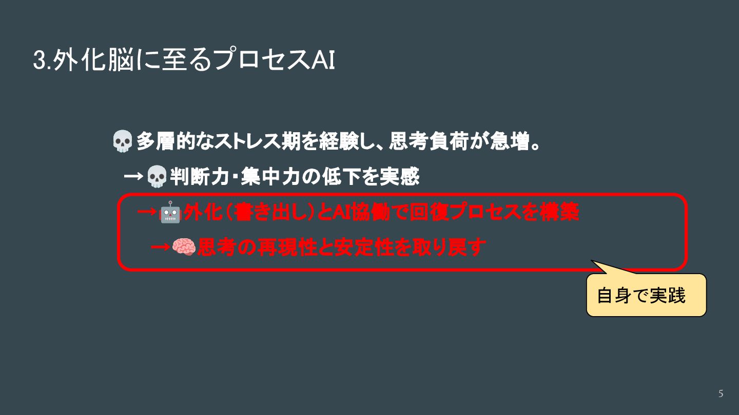 💀多層的なストレス期を経験し、思考負荷が急増。 →💀判断力・集中力の低下を実感 →🤖外化(書き出し)とAI協働で回復プロセスを構築 →🧠思考の再現性と安定性を取り戻す 3.外化脳に至るプロセスAI 5