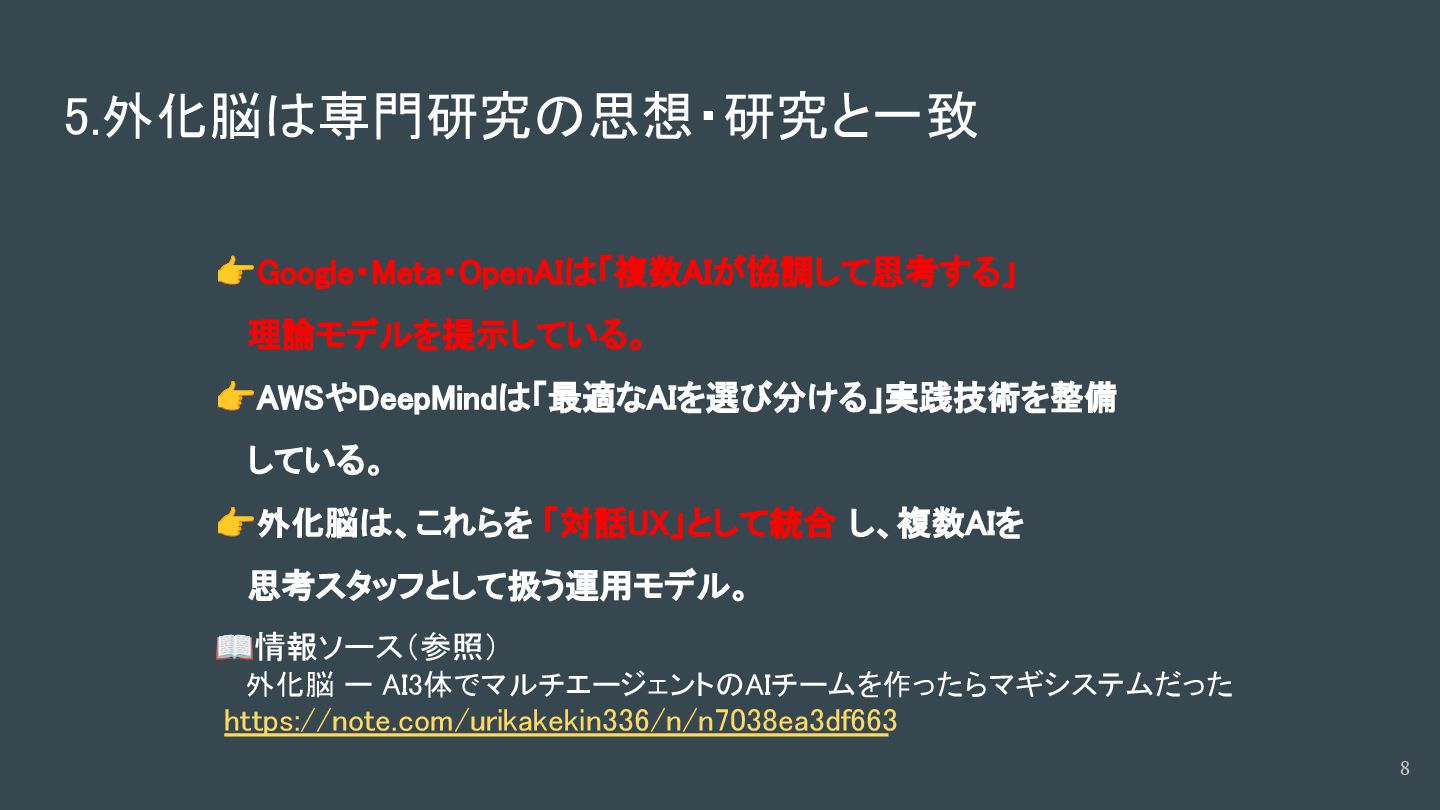 👉外化脳は、これらを 「対話UX」として統合 し、複数AIを 思考スタッフとして扱う運用モデル。 📖情報ソース(参照) 外化脳 ー AI3体でマルチエージェントのAIチームを作ったらマギシステムだった https://note.com/urikakekin336/n/n7038ea3df663 5.外化脳は専門研究の思想・研究と一致 8
