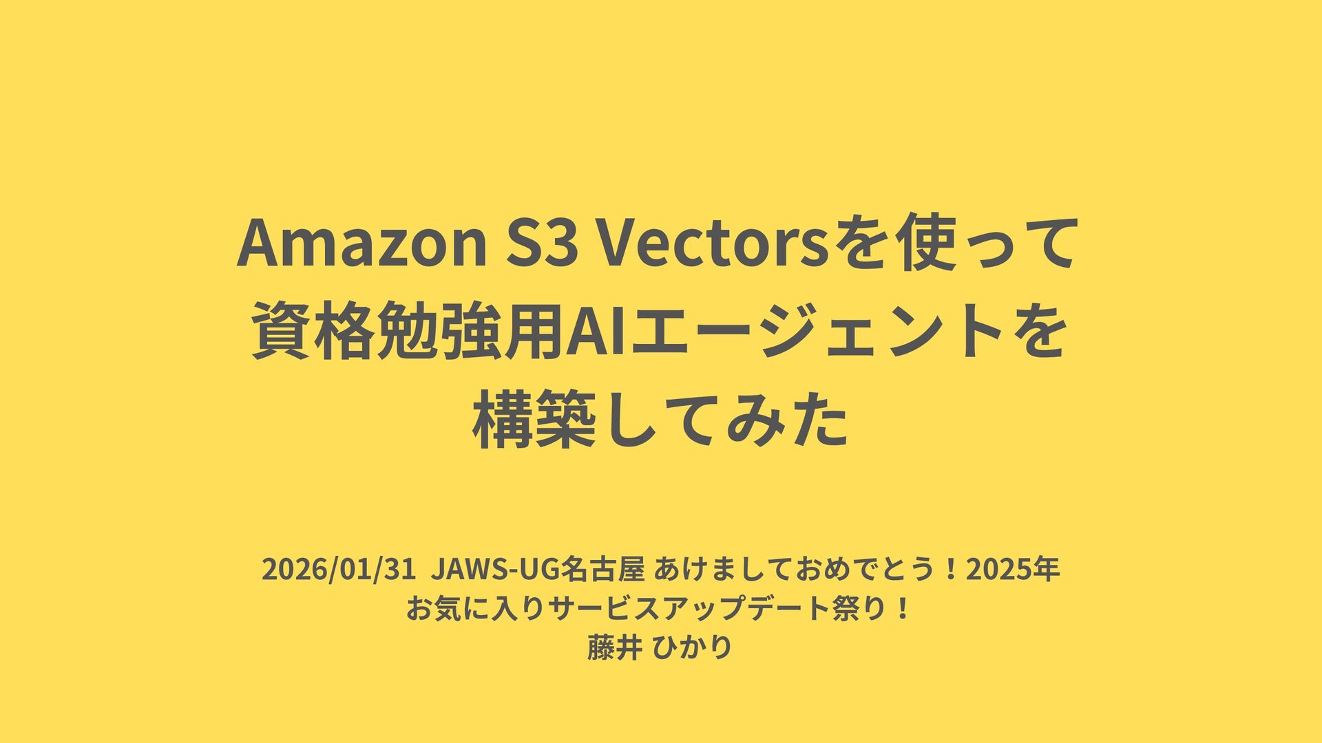 Amazon S3 Vectorsを使って 資格勉強用AIエージェントを 構築してみた 2026/01/31 JAWS-UG名古屋 あけましておめでとう!2025年 お気に入りサービスアップデート祭り! 藤井