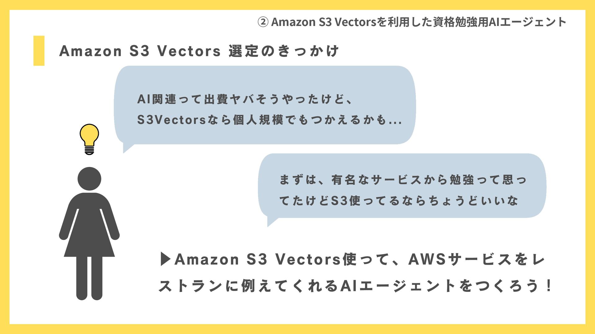 S3 Vectorsを利用した資格勉強用AIエージェント ▶Amazon S3 Vectors使って、AWSサービスをレ ストランに例えてくれるAIエージェントをつくろう!