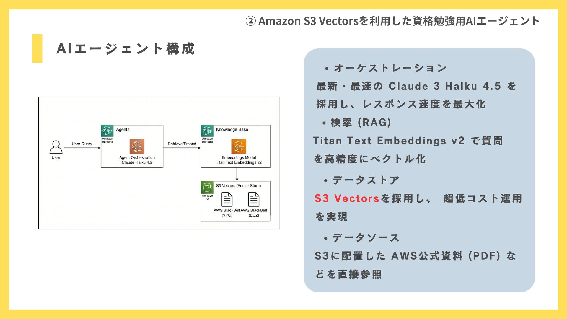 (RAG) Titan Text Embeddings v2 で質問 を高精度にベクトル化 データストア S3 Vectorsを採用し、 超低コスト運用 を実現 データソース S3に配置した AWS公式資料 (PDF) な どを直接参照 ② Amazon S3 Vectorsを利用した資格勉強用AIエージェント