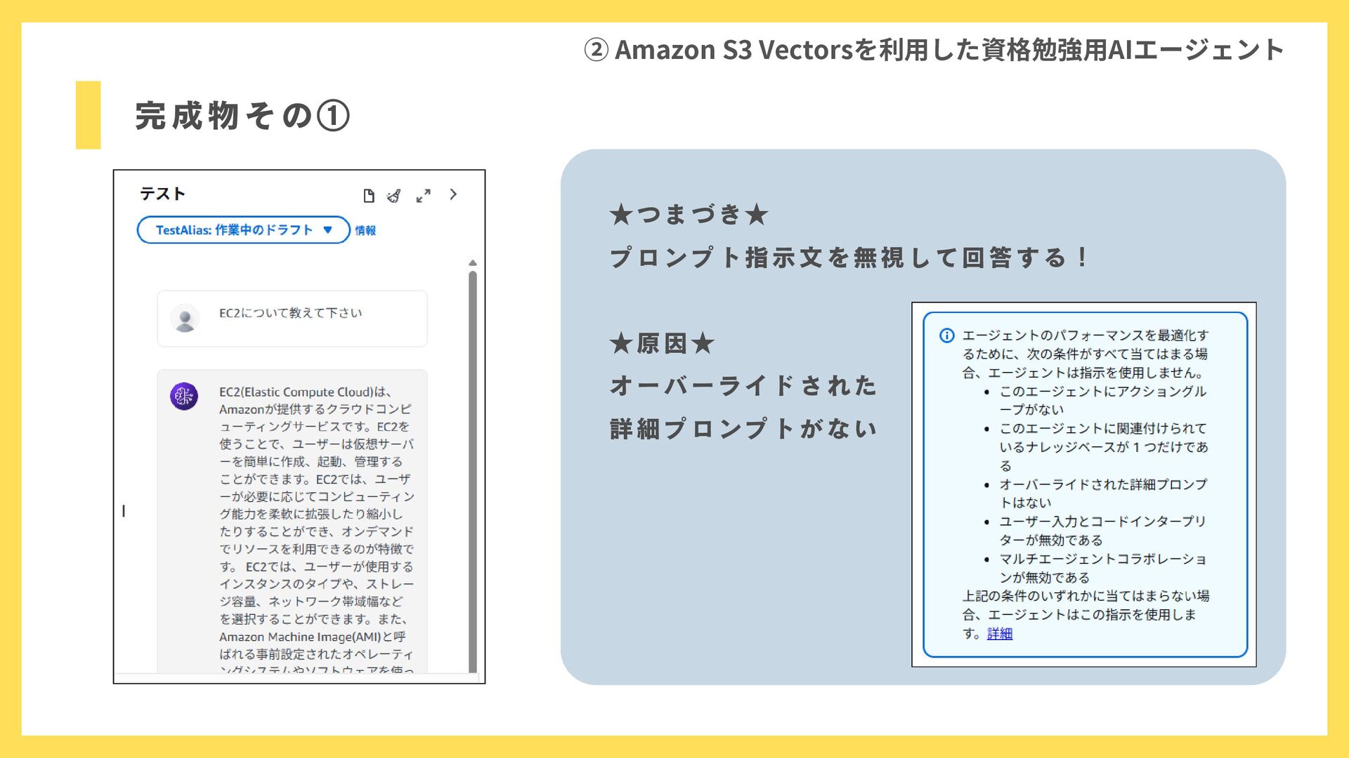 ★つまづき★ プロンプト指示文を無視して回答する! ★原因★ オーバーライドされた 詳細プロンプトがない 完成物その① ② Amazon S3 Vectorsを利用した資格勉強用AIエージェント