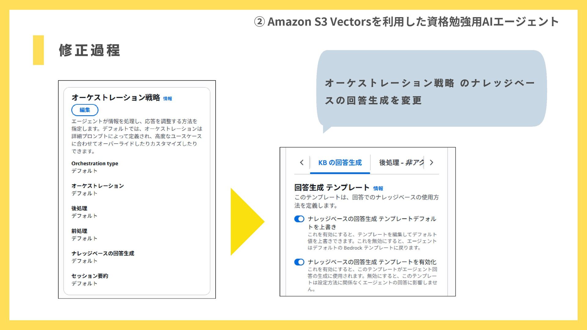 オーケストレーション戦略 のナレッジベー スの回答生成を変更 修正過程 ② Amazon S3 Vectorsを利用した資格勉強用AIエージェント