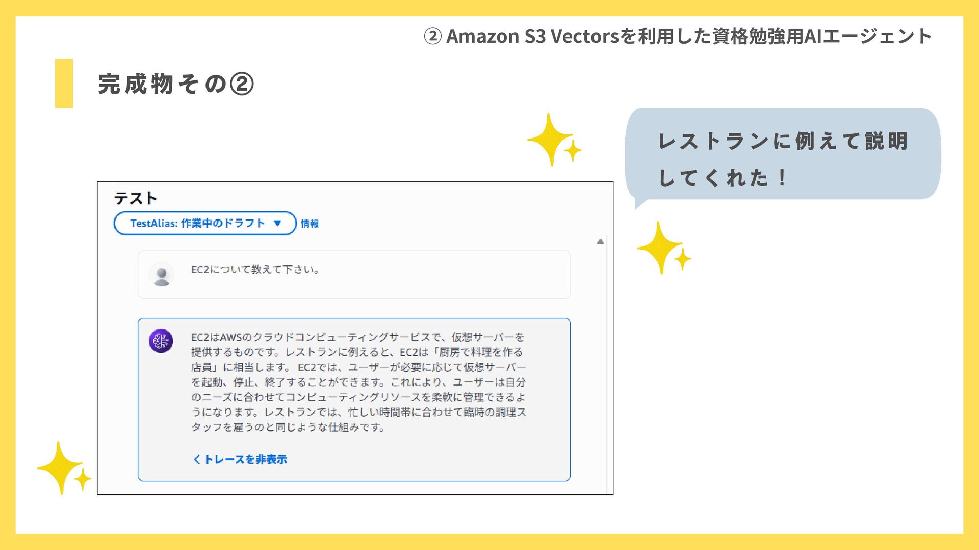 レストランに例えて説明 してくれた! 完成物その② ② Amazon S3 Vectorsを利用した資格勉強用AIエージェント