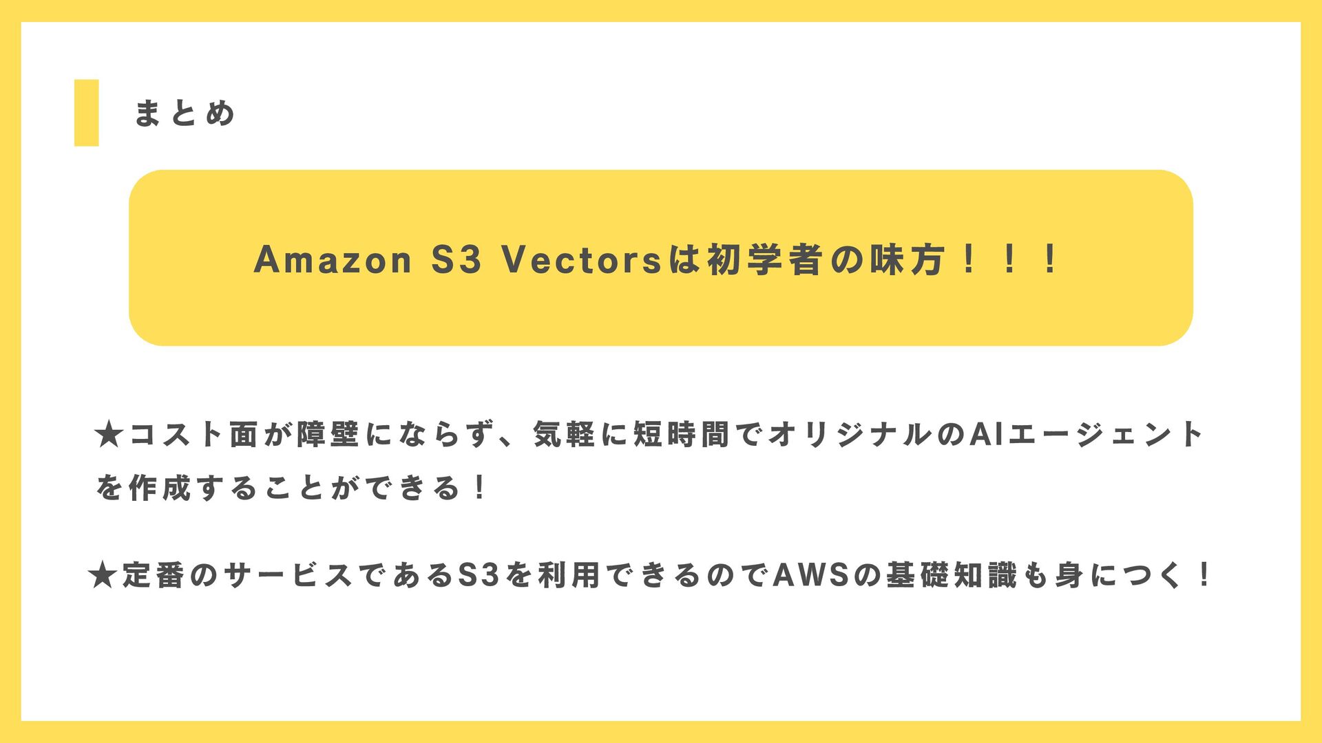 まとめ ★コスト面が障壁にならず、気軽に短時間でオリジナルのAIエージェント を作成することができる! Amazon S3 Vectorsは初学者の味方!!! ★定番のサービスであるS3を利用できるのでAWSの基礎知識も身につく!