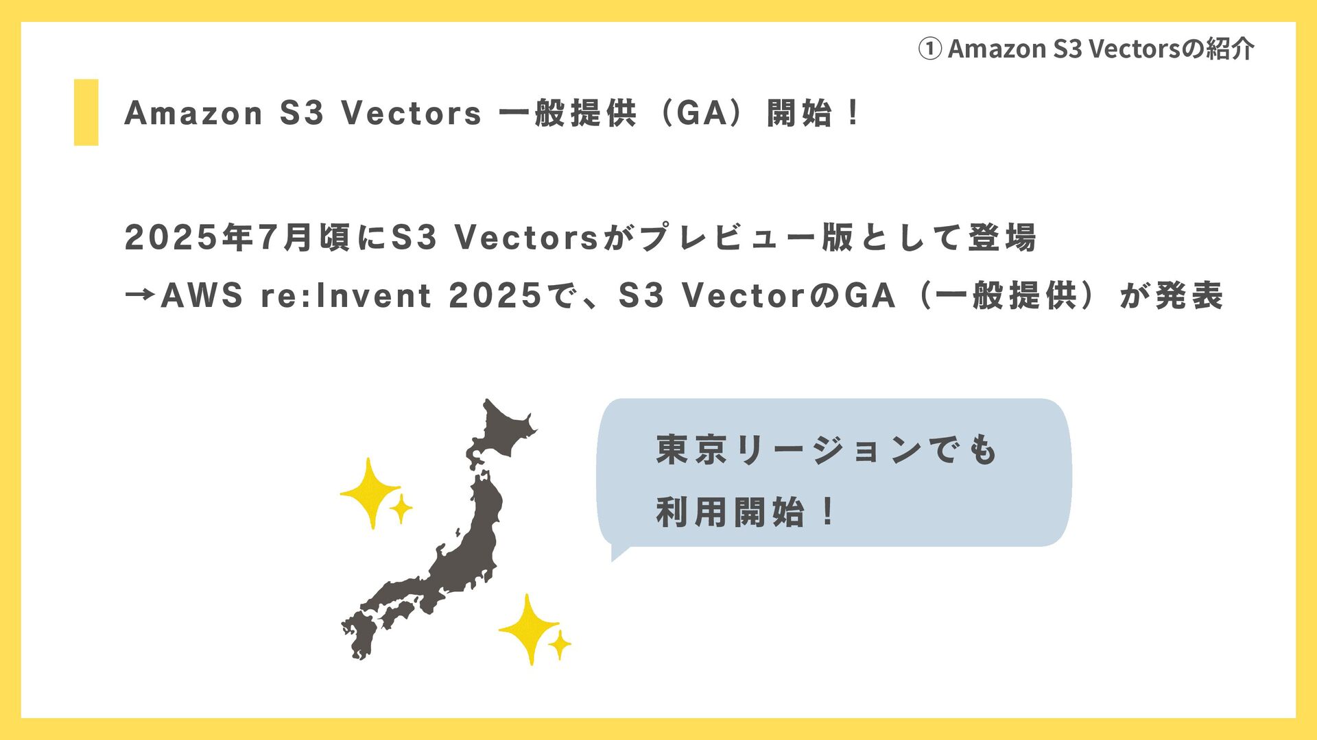 います。 ・[アップデート] S3 VectorがGAして、東京リージョンでも利用可能になり ました #AWSreInvent