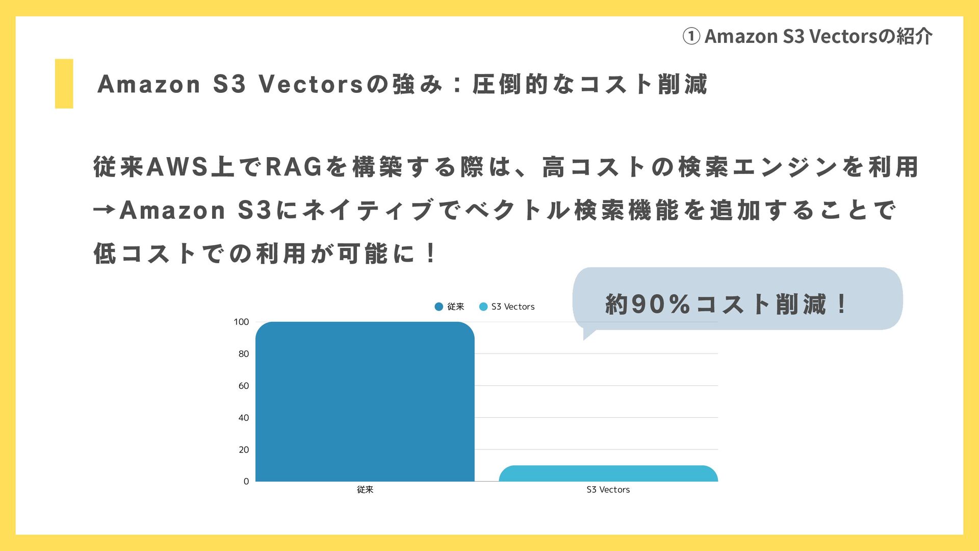 Amazon S3 Vectorsの強み:圧倒的なコスト削減 従来AWS上でRAGを構築する際は、高コストの検索エンジンを利用 →Amazon S3にネイティブでベクトル検索機能を追加することで 低コストでの利用が可能に! 約90%コスト削減! ① Amazon